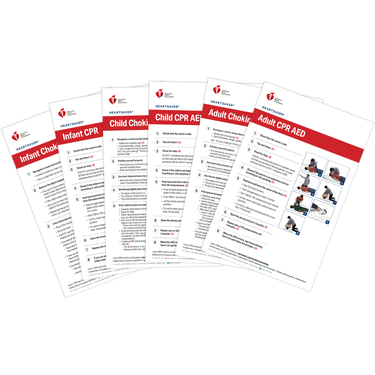 The AHA’s Heartsaver posters can be placed in many common areas at any worksite (such as lunchrooms, breakrooms, fitness centers, and meeting rooms) to provide employees and designated first responders a quick reference to recall the steps of CPR AED and relieving choking. These posters also can be used as a promotional tool to emphasize the importance of first aid and CPR AED training to prepare employees and rescuers to respond to a cardiovascular or first aid emergency.